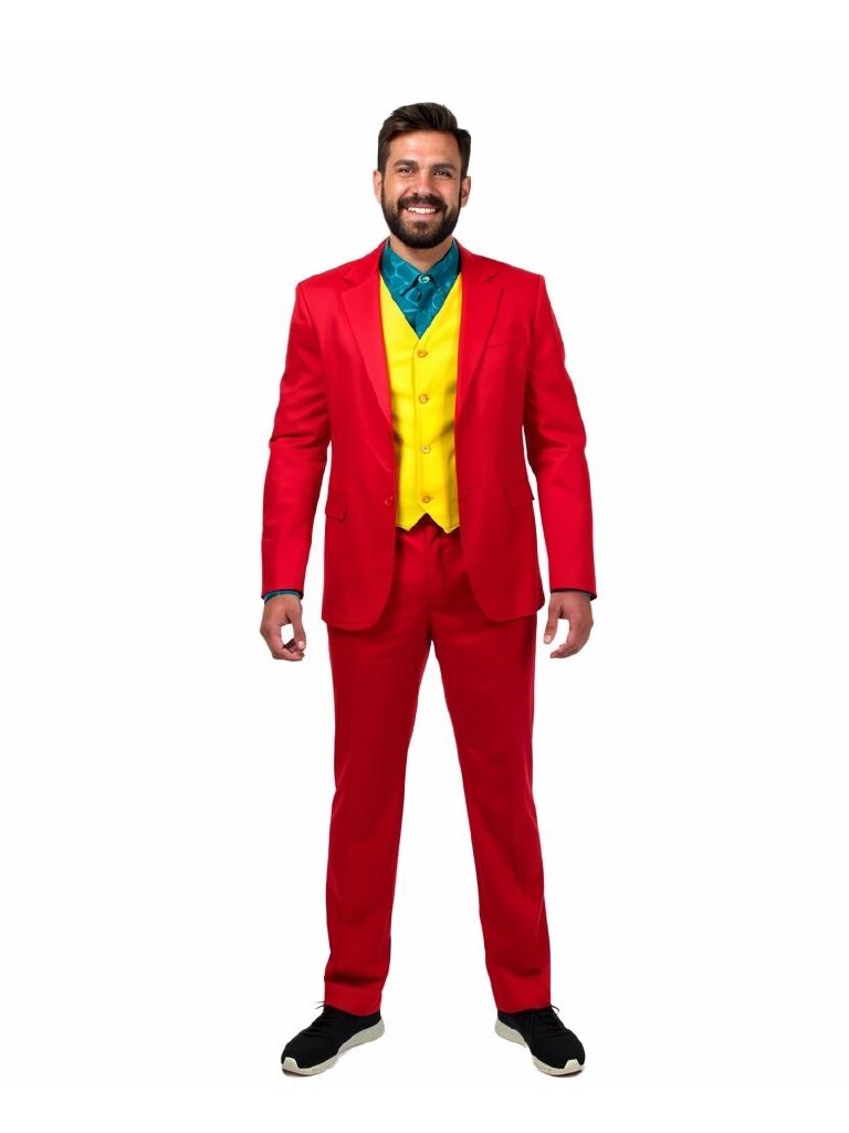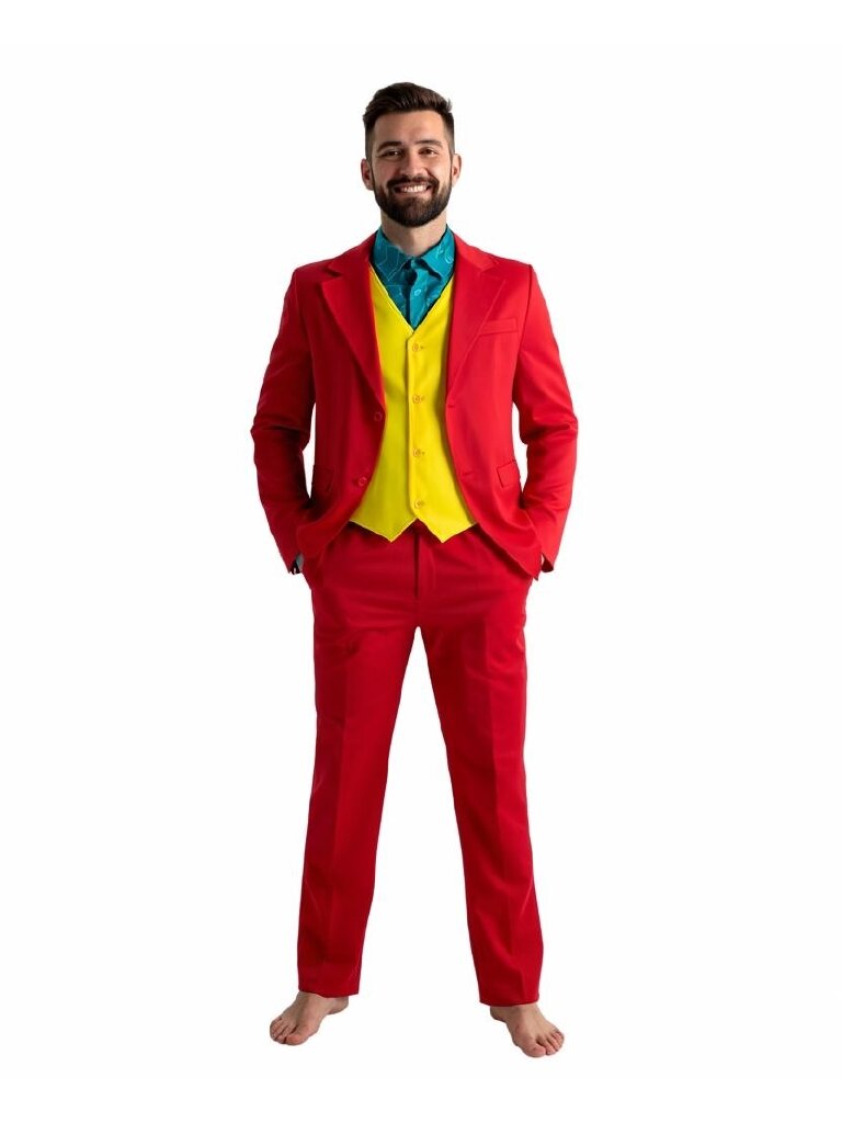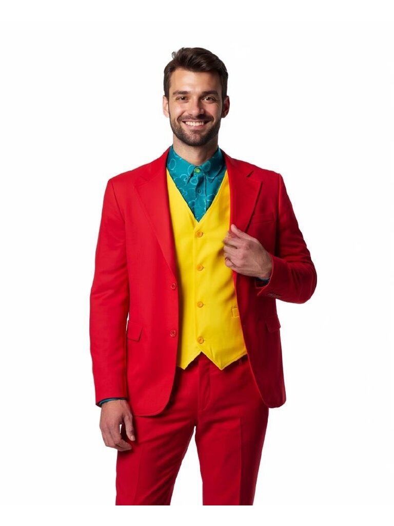 Взрослый костюм "Джокер" — идеальный выбор для Хэллоуина или костюмированной вечеринки. Комплект включает рубашку, жилет, брюки и пиджак, выполненные из полиэстера. Костюм выполнен в ярких красных и желтых цветах, отражающих образ знаменитого злодея из вселенной комиксов.